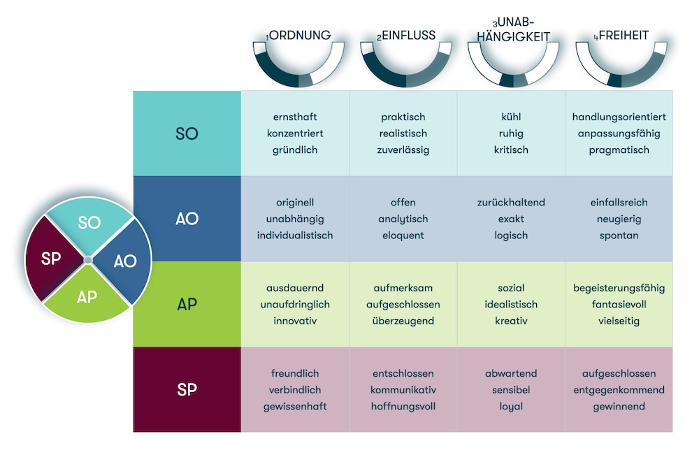Doch je nach Art der Schale unterscheiden sich diese vier Kerntypen in weiteren Eigenschaften. Ein AO-Typ kann zum Beispiel originell und unabhängig sein, aber auch neugierig und spontan. Je nachdem, ob in seinem / ihrem Leben eher die 1Ordnung oder die 4Freiheit im Vordergrund stehen.