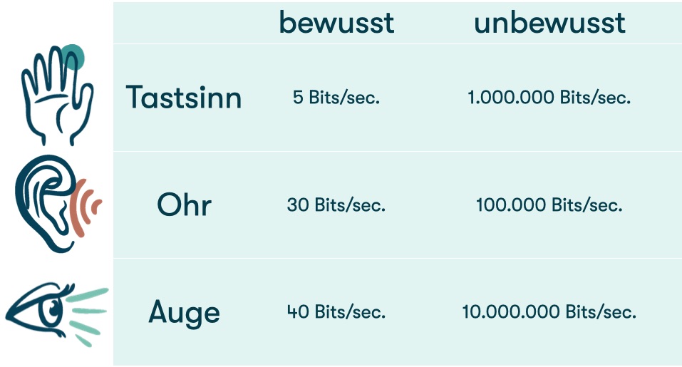 Die Menge an Informationen, die unbewusst über die Sinne wahrgenommen werden, sind um ein Vielfaches höher als die Menge der Informationen, die tatsächlich ins Bewusstsein gelangen.2