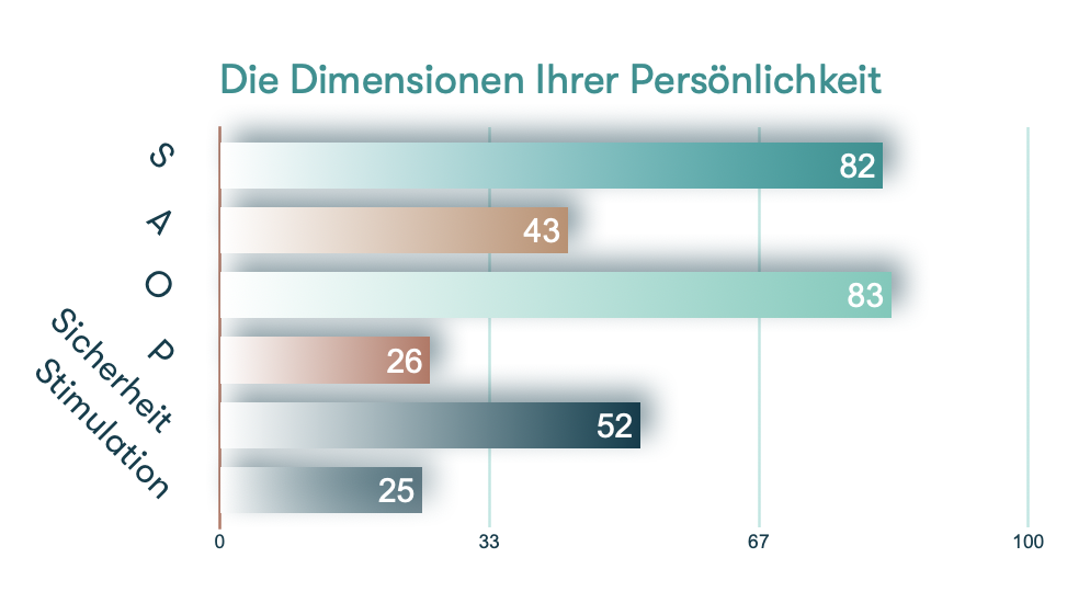 Unsere Persönlichkeitsdiagnostik vereint also nicht nur die verschiedenen, erfolgreichen Persönlichkeitstheorien, sondern auch die Vorteile eines dimensionalen und eines typologischen Ansatzes. Unsere 16 Persönlichkeitstypen leiten sich aus Dimensionen ab. Das heißt, wir können auf den ersten Blick eine grobe Skizze der Persönlichkeit einer Person bieten. Dies kann zum Beispiel nützlich sein, um bei einem Personalauswahlprozess einen ersten Überblick über die Bewerbenden zu erhalten. Auf den zweiten Blick ist es uns aber auch noch möglich, die genauen Werte und damit die Person ganz individuell ohne „Schubladen-Denken“ zu betrachten. Daher erhalten Sie in Ihrem FLOW-Guide sowohl die Zuordnung zu einem Persönlichkeitstyp als auch zusätzlich Ihre ganz individuellen Werte.