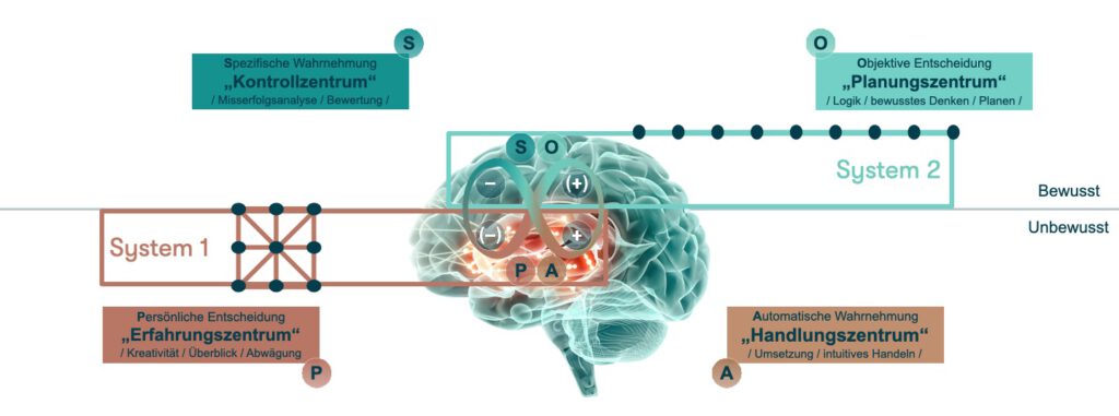 S und A – die Art der Informationsaufnahme – und O und P – die Form der Entscheidungsorientierung: Jeder von uns trägt Anteile davon in unterschiedlichen Ausprägungen in ihrer/seiner Persönlichkeit. Im Gehirn interagieren diese Muster permanent miteinander, je nach individueller Ausprägung der Persönlichkeitsschale, des Persönlichkeitskerns und der Motive.